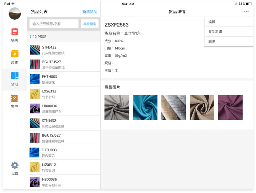 快速新增维护货品,面料成分、门幅、克重等一目了然。